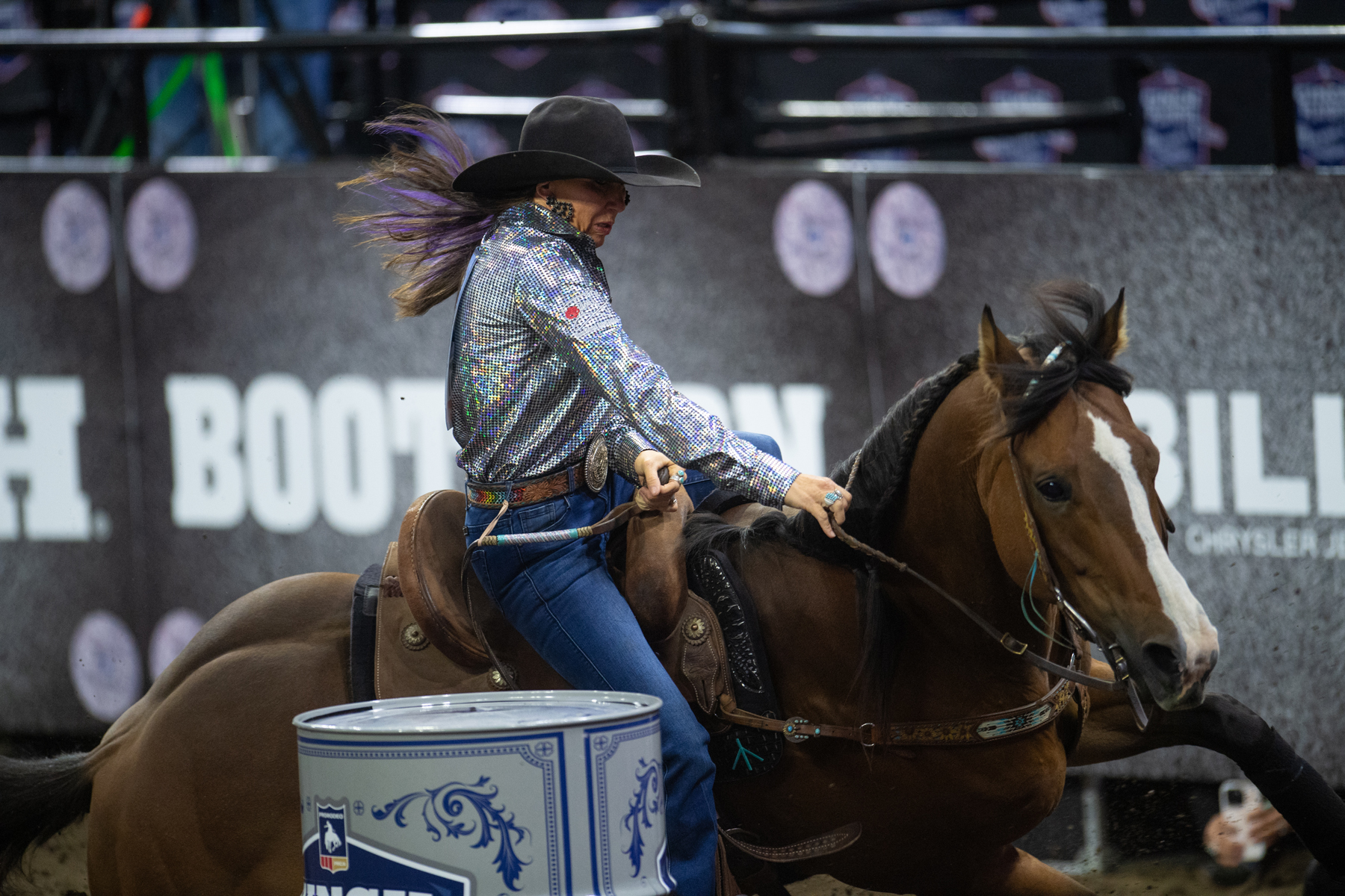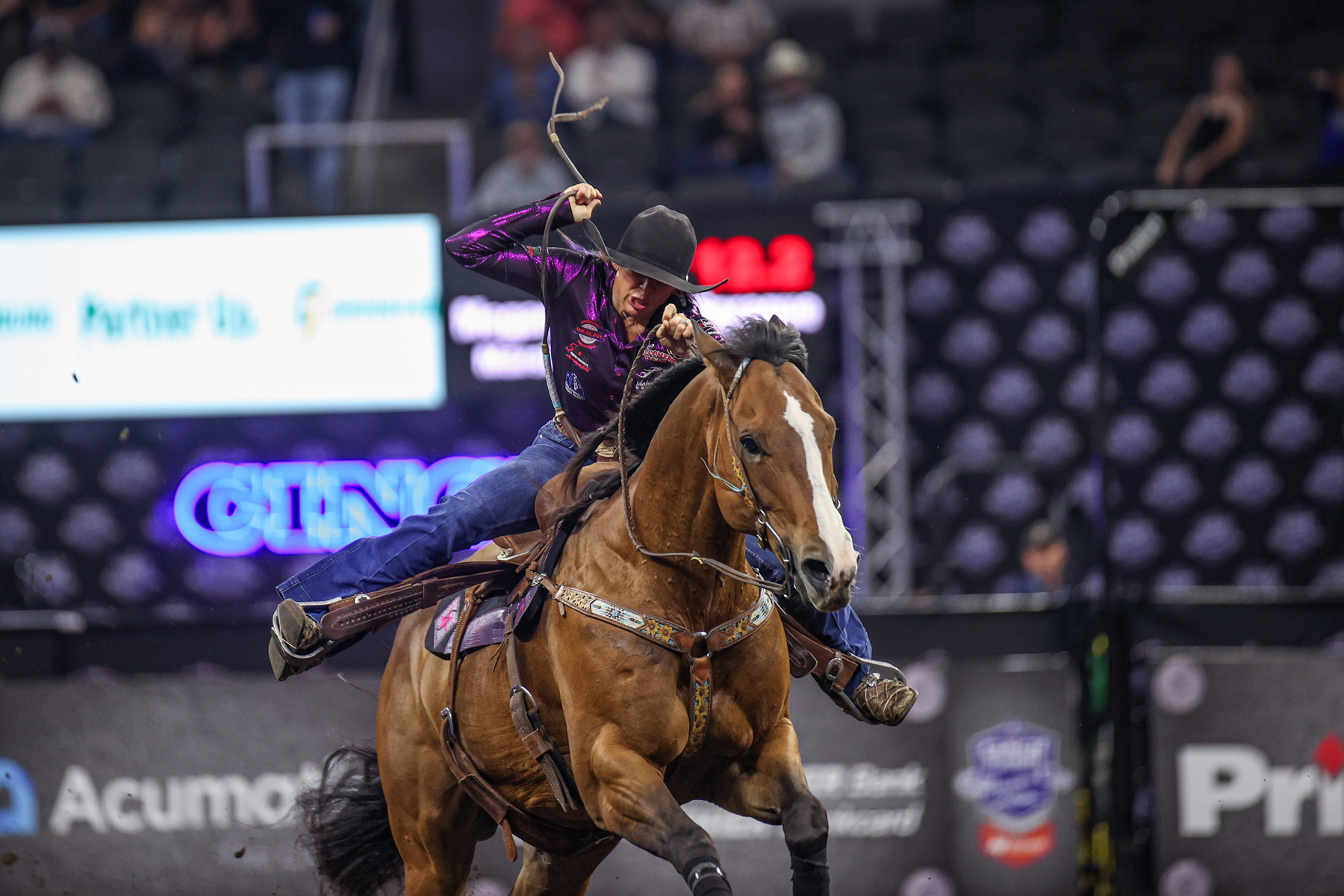 The track in the barrel racing definitely got faster with Hailey Kinsel taking the round win in a time of 14.20 seconds. Unfortunately, the four-time world champ had a downed barrel the first night and will not advance to the semifinals. She did add $11,911 to her 2025 standings with the winning run on Saturday night.