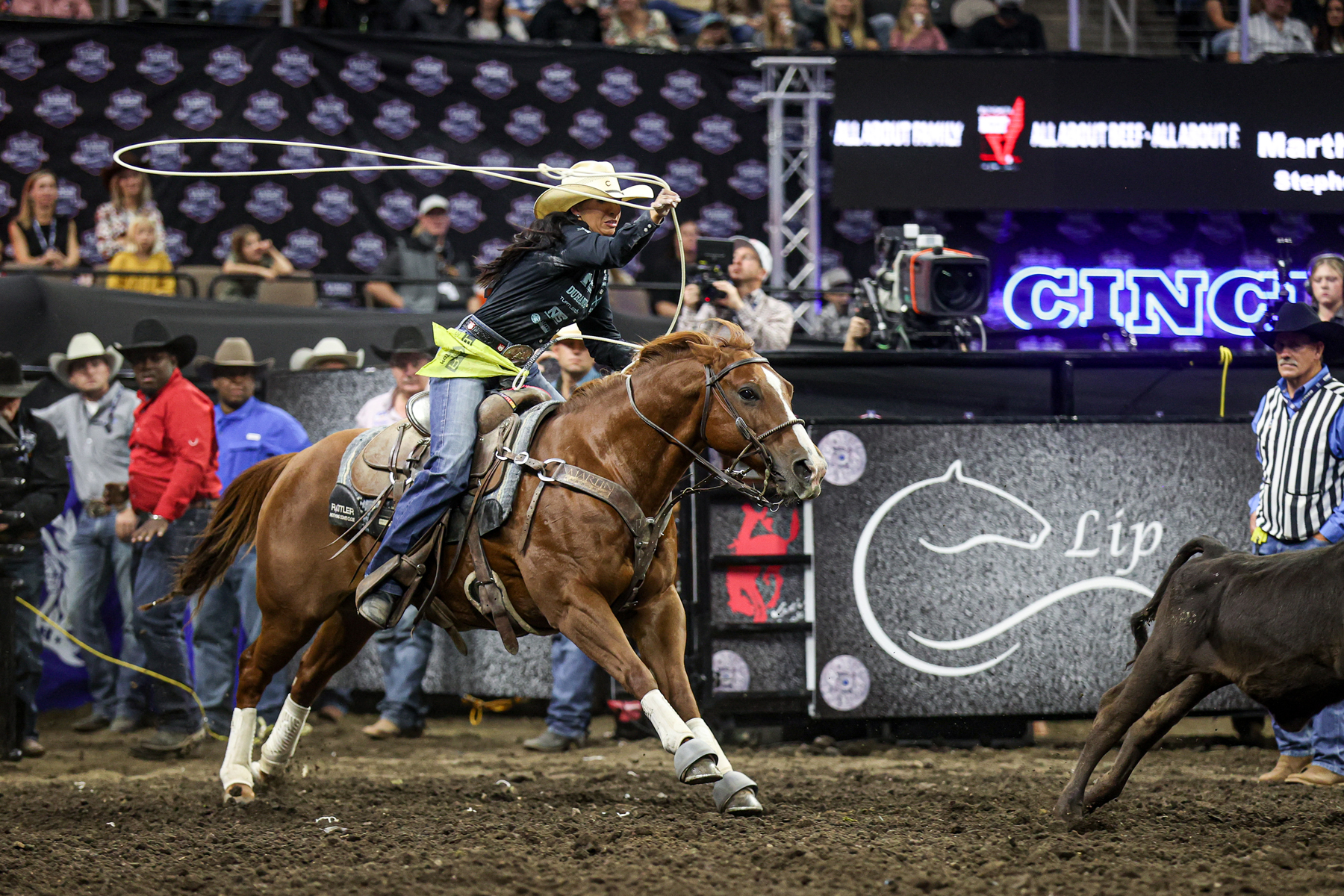 Breakaway roping: Round 1: 1. (tie) Taylor Munsell, Alva, OK and Rylee George, Oakdale, CA, 2.7 seconds, $10,422 each; 3. Beau Peterson, Council Grove, KS, 2.8, $5,955; 4. (tie) Maddy Deerman, Hope, NM and Cheyanne McCartney, Kingston, OK, 2.9, $1,488 each. Round 2: 1. (tie) Martha Angelone, Stephenville, TX and Aspen Miller, Santa Fe, TX, 2.5 seconds, $10,422 each; 3. Cheyanne McCartney, Kingston, OK, 2.5, $5,944; 4. Bailey Bates, Tohatchi, NM, 2.7, $2,977; Average (qualifiers for semifinals): 1. Cheyanne McCartney, 5.4 seconds on two head; 2. Taylor Munsell, 5.5; 3. Aspen Miller, 5.7; 4. Maddy Deerman, 15.0; 5. Josie Conner, 15.3; 6. Martha Angelone, 2.4 on one head; 7. (tie) Bailey Bates and Rylee George, 2.7.