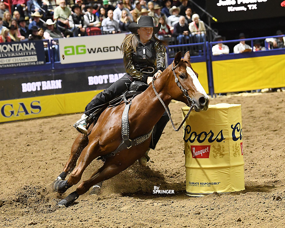 All the top 15 are not only competing for cash in the arena but a chance to be named the 2025 Jerry Ann Taylor Best Dressed Award winner presented by The Cowgirl Museum and Hall of Fame. Julie Plourde got the call to compete in the NFR after Anita Ellis was forced to turn out due to a head injury resulting from a horse accident. When Anita’s husband, Brandon, called Julie to congratulate her, she asked what Anita’s favorite color was. He stated it was black and so Julie suggested to the other barrel racers to wear black during the second round, so they were all riding for Anita on Friday night.