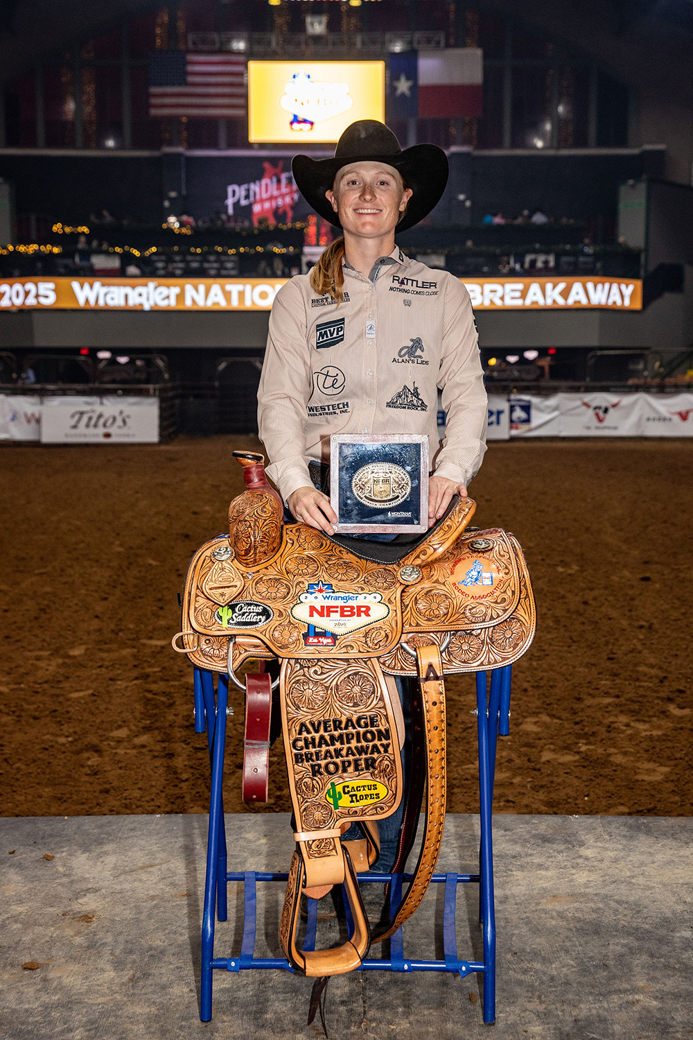 Rylee George was the most consistent roper over the 10 rounds of the 2025 Wrangler National Finals Breakaway Roping and left Cowtown Coliseum as the average champion. She set a new average record in a time of 29.0 seconds on 10 head, surpassing the old record set in 2022 by Cadee Williams with a 31.9. She was the only one in the field of 15 to have 10 clean runs.