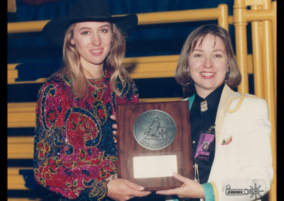 The duo qualified for their first National Finals Rodeo in 1984 in Oklahoma City and entered the competition ranked second. It had been a year that saw James and Lee Ann Guilkey go back-and-forth all season. In the end, James claimed the 1984 WPRA Rookie of the Year title and her first world title, earning $53,499 over Guilkey’s $48,709. James was awarded a truck courtesy of Dodge.
